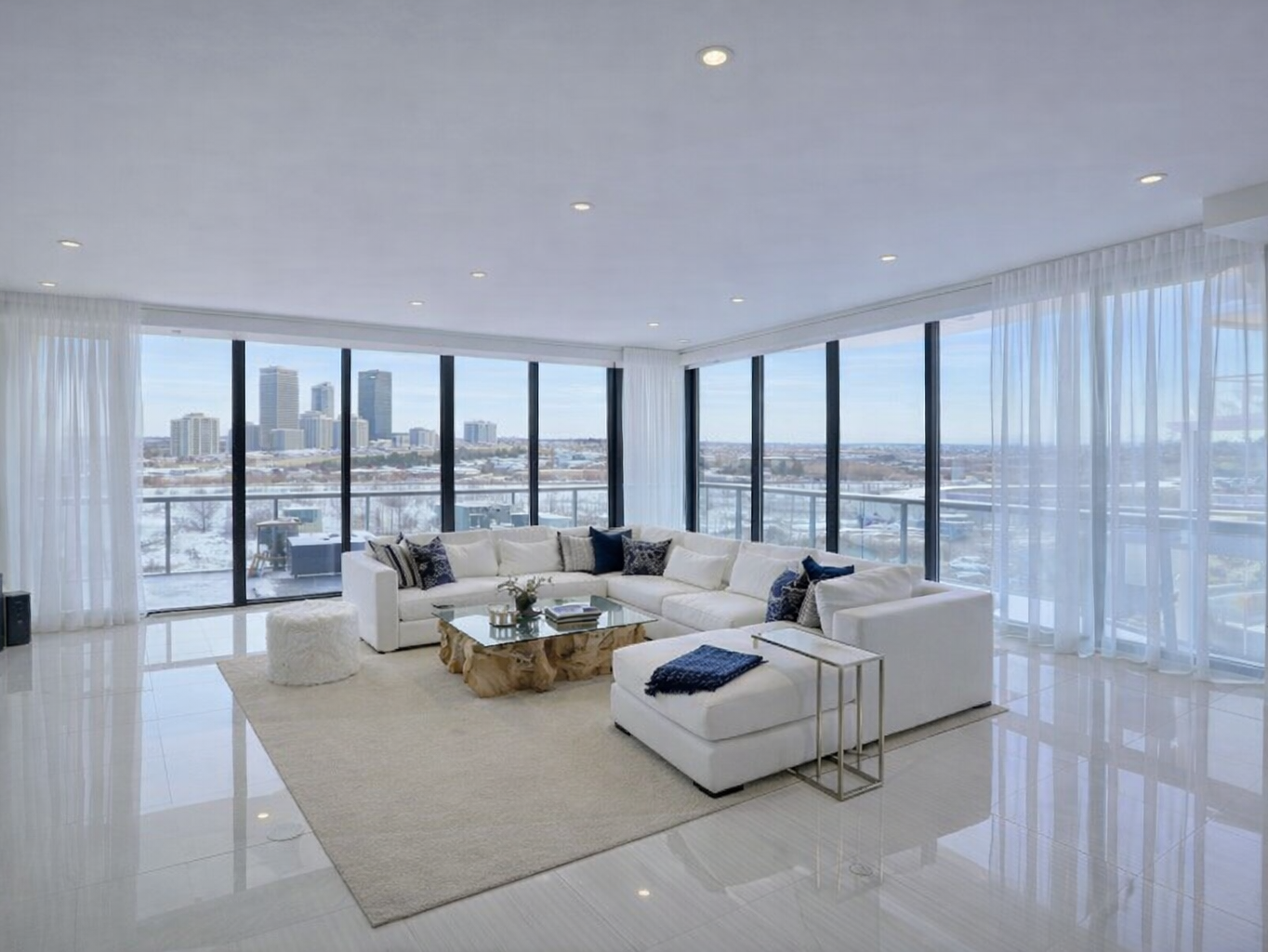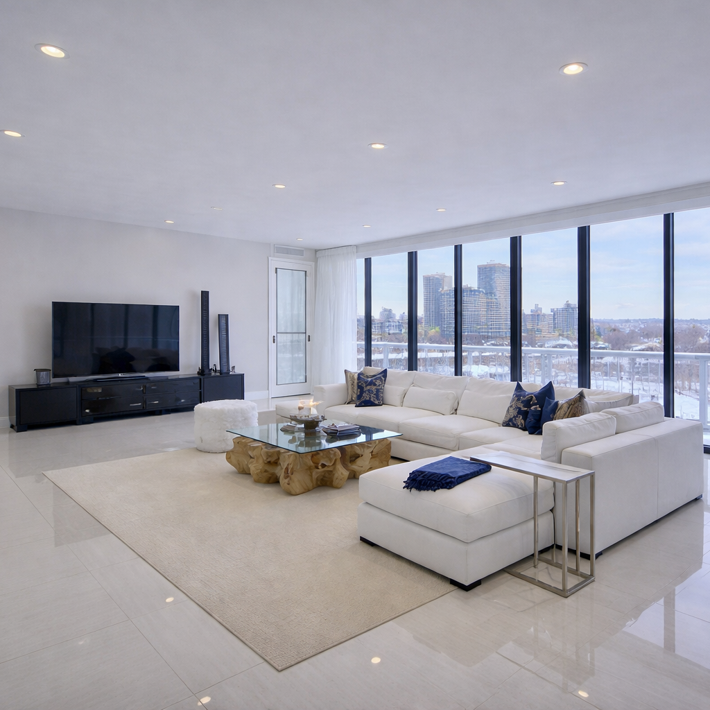 Luxury stretch ceiling for a high-end penthouse suite. Seamless satin finish across the entire open-plan space – elegant, flawless and built to impress
